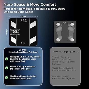The Dr Trust USA Hercules Smart Body Fat Analyser & Composition Scale 525 is an advanced digital weighing scale designed for individuals who want complete control over their fitness and health. Built with high-precision sensors, it delivers accurate body weight readings while also analyzing multiple body composition metrics such as body fat, muscle mass, bone mass, hydration level, BMI, BMR, and more.